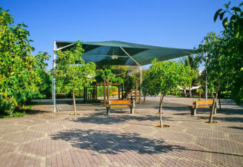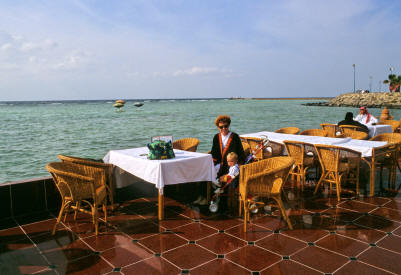 Jeddah has it's own Corniche which runs along the sea shore. This has some great open-air restaurants and cafes as well as other little amusements. As this is a public area Clair has to cover the shape of her body with a black Abaya. The hotels tend to cluster along the shoreline and the Sheraton has one of the best Indian restaurants we have ever visited. They all do good buffets in the evening and most of the time we eat outside. The climate is near perfect in the evenings and there are no mosquitoes. The newer parts of Jeddah have outrageous modern sculptures on the roundabouts which are useful landmarks for foreigners trying to find their way around.