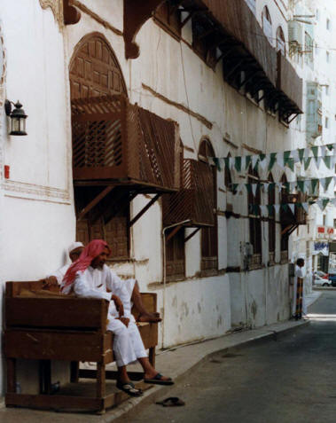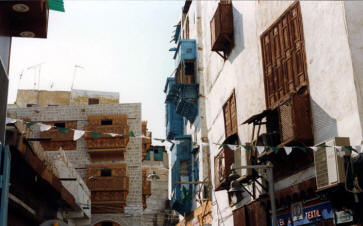 Jeddah is an old city which, despite extensive modernisation, has retained some traditional buildings. These show how people lived before air conditioning. The older houses have elaborately carved wooden lattices as windows or sometimes as little balconies. Here residents can sit or sleep in the evening, with full privacy, but still get the benefit of a cool breeze through the house. The streets are close together so the buildings give each other shade.