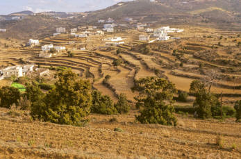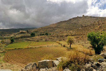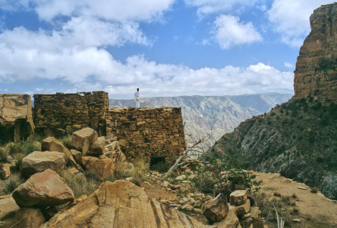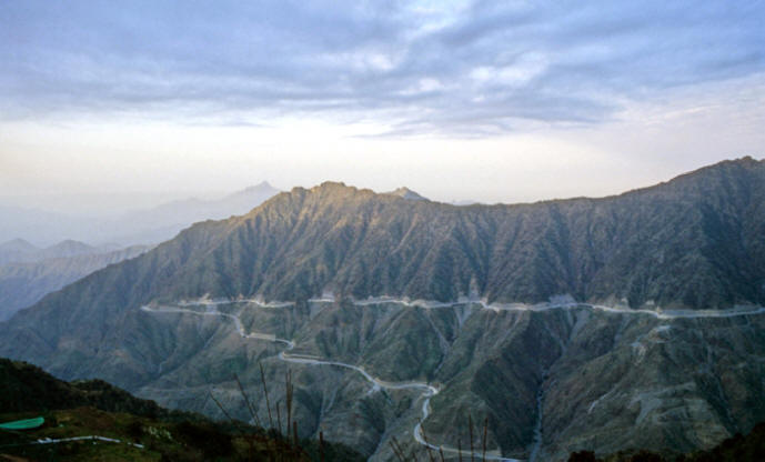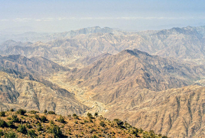 Winding Road to Baha - we drove this in thick fog. The view from the hotel next morning was stunning and gave us a clear picture of the road we took in heavy fog the previous night. The houses in Baha all had heavy bars on the windows. As we discovered this was not due to high crime levels (Saudi has very little theft) but to keep the wild monkeys out! We set off the next day along the mountain range towards Abha. Here mountains soared to over 10,000 feet and there is enough rain to keep the land fertile without irrigation.