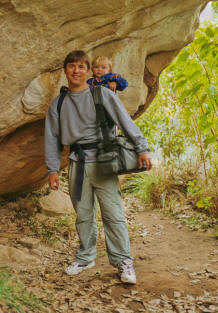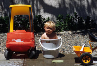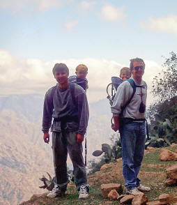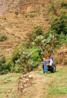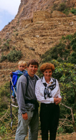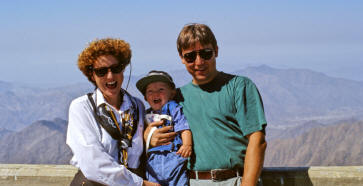 Edward takes a bath in our Jeddah Garden Mother and baby February 1996 - Trip to Abha, South West Saudi Arabia  Views on the Road to Baha Since living in Saudi with my parents in the 1970s I'd always wanted to visit the South West, where there are mountains, tropical birds, wild monkeys and a different culture. The most interesting route would be to drive from Jeddah to Taif and then drive along the top of the mountain range to Abha, stopping the night in Baha on the way. This would give some spectacular views of the mountain range and the western deserts of Saudi Arabia. Before the Ramadan Eid break I put a notice up in the compound stating my plans and asking if anybody wished to join us. We got a group of over 20 people together. Just before I left for Abha I had a phone call from my Boss. The merger between my company and another had finally started to affect us in the Middle East and he had been made redundant on 14th February. He called it "The St. Valentine's Day Massacre". I was sure that the way things were going that the rest of our people in the region would be next, including me, so I thought it best to make the most of my time in the country.