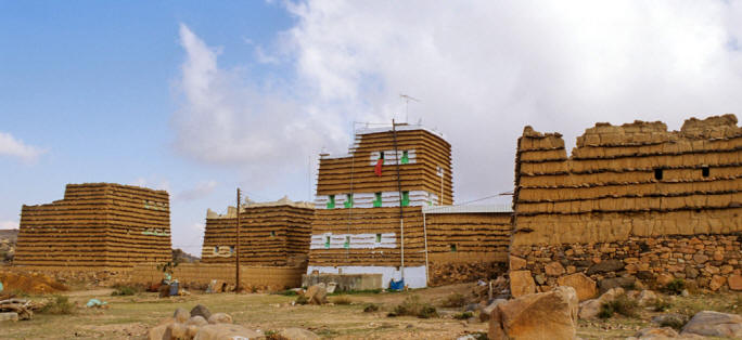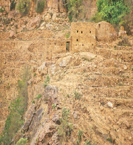 Abha Architecture Fertile Terraces The architecture here is reminiscent of African styles. Many are made of mud and still inhabited by the locals. The stone ribbing is designed to protect the mud from being washed away by the rain. The features of the people also look more African or Yemeni here. We also noticed there were colourful tropical birds from Africa as well as the wild monkeys. Africa is just a short hop over the Red Sea from this region.