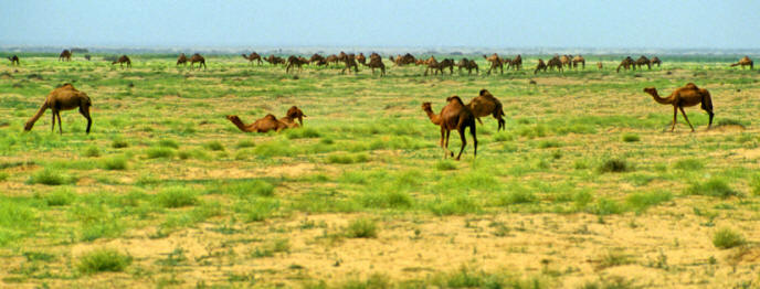 Road to Baha. Camels feed on the new grass after the spring rains.