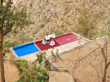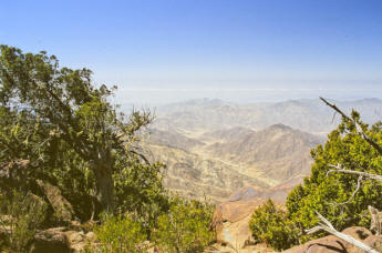 Landscape is very different from the harsh desert around Riyadh. I had booked the group into the Abha Intercontinental Hotel. We've used this as a conference facility and it must be one of the most spectacular settings of a hotel anywhere in the world. It is a sprawling converted Palace and has one huge domed conference room which seats nearly 600 plus interpreters. Most of the year the hotel is virtually deserted, but makes its money from one or two giant conferences. Other than us, it had less than a dozen guests when we were there and we rattled around in its great facilities. We even negotiated with the staff to allow the women to use the swimming pool - usually not allowed in Saudi - although they insisted the women swim alone, locked the facilities during their swim and insisted on cleaning the pool afterwards! The hotel is spectacularly situated on top of Mount Sodha, at 10,000 feet elevation and facing west towards the sun as it sets over the Red Sea.