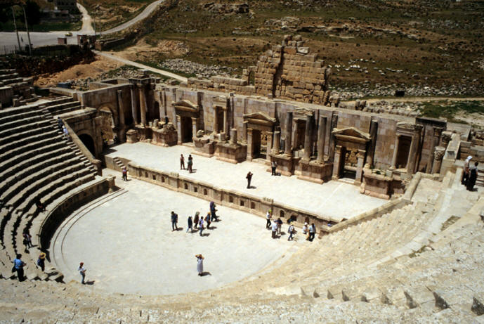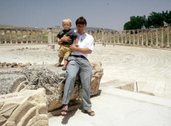 Jordan The Haj break in March gave us the chance to drive to Jordan. The last time I visited Jordan was in 1975. I was living in Baghdad with my parents at the time and we drove there for a holiday. I celebrated my 13th birthday on a beach in Aqaba, but particularly remembered the spectacular ruins in Petra and also Wadi Rum, where T.E. Lawrence amassed his troops before sacking Aqaba in 1916. Lawrence crossed the Nephud desert, thought an almost impossible task at the time, allowing him to attack the Turkish stronghold in Aqaba from the rear. The huge Turkish guns in Aqaba pointed out to sea, the only direction from which they thought an enemy could invade, and they were unable to turn them round to fire on Lawrence and his heroic Arab army. Some of David Lean's "Lawrence of Arabia" was shot here - one of the greatest films of all time. Clair is quite pregnant now, with a baby due in August. As we planned the trip with another couple, who were similarly pregnant, we decided to put the car on a trailer and send it over night to Tabuk, a town near the Jordanian border. This allowed us to fly there the next day, collect the car and drive to Amman. This saved us a day's arduous drive through the boring northern deserts of Saudi Arabia. The prize for the most friendly border guards in the world goes to the Jordanians on the Saudi - Jordan border, who personally made us tea and smiled and chatted pleasantly about the great sights in their country whilst processing our documents. This was a real contrast to the suspicion we usually receive from Saudi officials. We booked into our Hotel in Amman, drank some real wine (what a relief) and next day headed north for the Roman ruins of Jerash - possibly the best Roman ruins I have seen outside Ephesus.