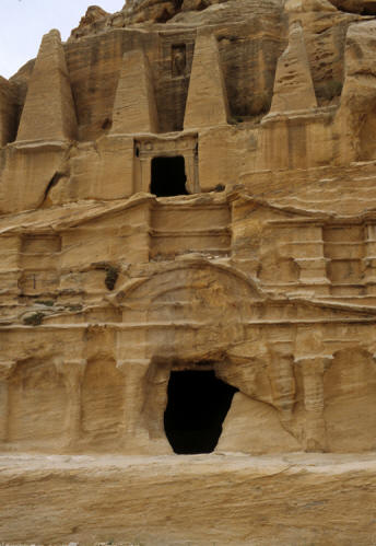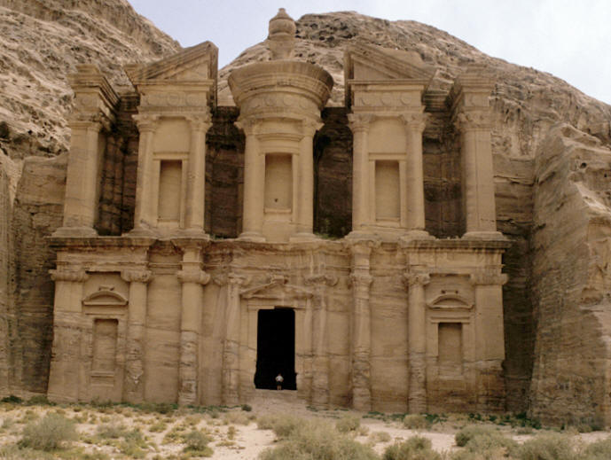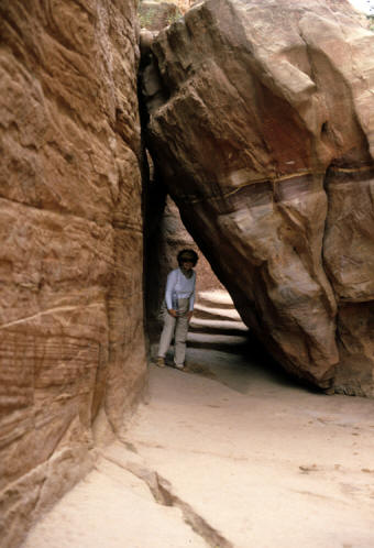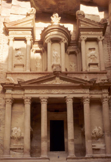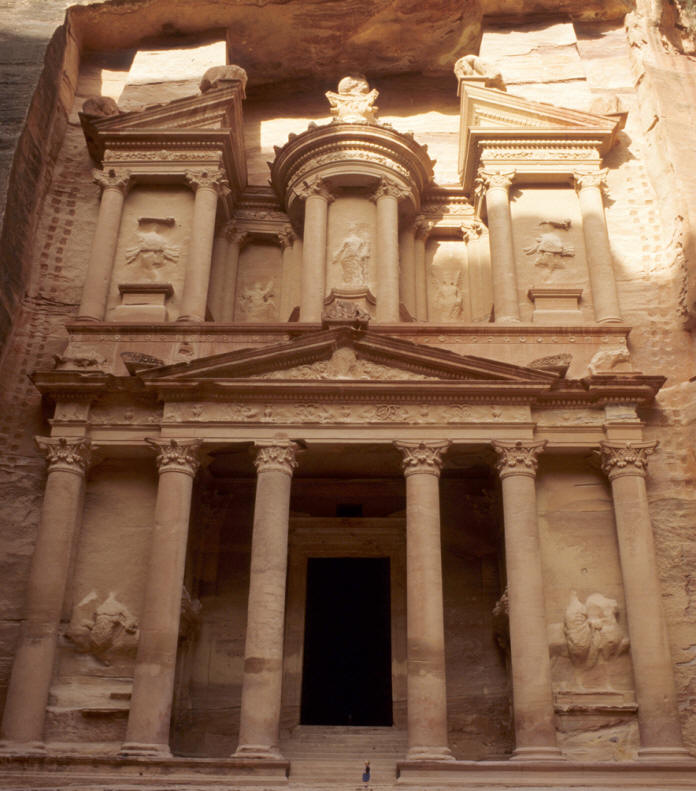 Treasury Building, Petra Edward climbs the steps of the Treasury Building Petra is an ancient city literally hewn out of solid, beautiful, rose coloured rock. The first time I went there I was able to go through the narrow gorge and explore the ruins entirely on horse back and only shared it with my four little sisters, parents and about 25 tourists. Twenty one years later it has caught on as a tourist attraction, and gets literally thousands of visitors a week. For a small fortune you can ride a horse part of the way to the main site and share it with the whole world and his dog. However the first glimpse of the treasury building as you emerge from the narrow canyon is unforgettable. It took us two days to see the main attractions.