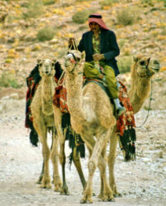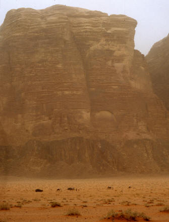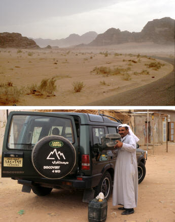 4X4 and Camel Train in Wadi Rum Filling up in Diesel Having previously visited Wadi Rum in 1975 I was looking forward to some spectacular desert scenery, some T.E. Lawrence history and a true Bedouin experience. On leaving our hotel I asked the occupants of my Land Rover to look out for a petrol station. Petrol stations in Jordan are very primitive and easy to miss. Needless to say we all forgot and ended up in the middle of the desert, miles from anywhere, during a sandstorm with the petrol gauge stuck on zero. With no food and two pregnant women in the car this was serious. We found a lone soldier at a check point and asked for some "benzene" (petrol). He seemed to understand and pointed ahead and said "Diesel, 5 Km". As my Land Rover has a petrol engine this sounded a little dubious (would they sell petrol as well?) but we had no choice and headed in his suggested direction. You can imagine my concern when, with the petrol gauge now showing less than zero, we arrived at a small village called "Diesel". We drove around this primitive collection of mud huts totally forlorn, until my eagle eyed friend spotted a mud hut with some jerry cans outside. This turned out to be the local petrol station, and for a price we were saved. Petra