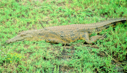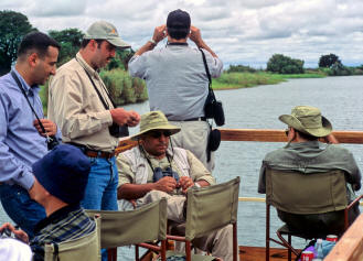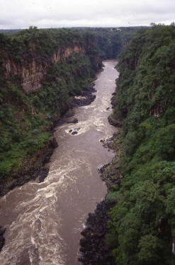 Victoria Falls Victoria Falls  Victoria Falls Bridge Victoria Falls The following day we drove to Botswana's Chobe Reserve. I was accompanied by some South African colleagues who are veterans of Safari and game parks. They assure me that this park has one of the highest concentrations of game in the world. Couple this with the fact that Botswana is one of the few reasonably well run countries in Africa and relatively affluent (diamond mining) and you have a good cheap family holiday destination. The game was dramatic. The morning was spent drinking beer on a boat floating serenely down the Chobe river as we watched hippos and crocodiles. The Zimbabian guide showed a sense of humour when he informed us that a group of Hippos (we were viewing 16 at the time) is called a "Pod" or in American English - "Gee, a whole bunch of 'em". Our American boss didn't see the funny side and our South African colleagues blighted their careers by failing to control themselves adequately.