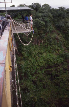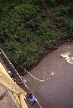 Victoria Falls Hotel Actually the President, Robert Mugabe was also there for the weekend to celebrate his birthday. As you know he is a little anti-British at the moment (some grumble over white farmers) so it surprised me to learn that this Hotel is his preferred retreat. The original decorations are still there complete with huge maps of Africa, which was mostly coloured pink and showing names such as Rhodesia, British South Africa, British Matabeleland, British Somaliland...as well as large oil paintings of King George V and Queen Mary. The furniture and decor reminded me of my Grandmother's old house near Windsor. Bungi JumpThe verandah and lawns overlook the spectacular Victoria Falls Bridge, built as a railway bridge by the British in about 1900 to span the Zambezi River and join what is now Zimbabwe to Zambia. It also hosts the worlds highest natural bungi jump dramatically advertised as "111 metres of pure adrenaline and mind smacking rush". The heart stopping 111 metre drop ends in a seething cauldron of rapids and (apparently) more crocodiles. Who could resist? Well apparently everybody in my party except for me. After a fruitless week spent trying to convince somebody to come with me I eventually persuaded one lone Australian colleague to come and watch. The bridge is between the Zimbabwe and Zambian border so there is a walk from the hotel followed by Zimbabwe immigration. I paid a deposit at the hotel and booked a jump for 11.28 in the morning. This is such an precise time that I was surprised to be the only one there - no queues - in fact nobody else had made a booking all day. It was also raining which, I was informed by the bungi staff, meant we could not jump. "Why?" I asked innocently, "does it make the bridge slippery?". "No" they said - "when the bungi cord gets wet it is inclined to snap". By this time I'd already paid the balance of the $US90.00 fee so I watched a few videos of previous jumps and tried to reassure myself that there were, so far, no fatalities (at least not ones they were prepared to show on video). Soon the rain stopped and they started preparing me for what they called the "flight". My Australian colleague was trying to reassure me about the bungi cord snapping whilst he took photos. He reasoned that if it did snap it would already have broken the fall and I would be near the water so the fall wouldn't kill me. "Of course you'd be in the rapids", he said, "with your feet tied together with no life jacket and there are crocodiles"........ I've often wondered if Australians are really on our side.....The rest is a blur (in fact 111m of pure adrenaline and mind smacking rush blur) and I've got the video to prove I did it. Now I know how it feels to gracefully swallow dive to your death - but in perfect safety. Interestingly I had sciatica in the months before this jump and haven't had a twinge since. Obviously the stretching of my spine popped out a nerve. To see a video of the bungi jump click here: