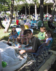 Aunt and Cousins Learning to ride We've had Clair's mum, sister and two nephews to stay. They had a great time, doing lots of shopping and the usual sight-seeing. I had hoped to take them all to a Chicago Bears (American Football) game, but Soldier Field is being redeveloped and they are playing their home games some distance away in Champagne (southern Illinois). Apparently the local University in Chicago had a more than an adequate alternative but they wouldn't allow the sale of alcohol in their stadium. Evidently the Bears felt there would be less rioting by making their fans travel an extra 180 miles than risk denying them a beer during crucial moments in the game. Instead we went to see the Chicago Blackhawks play Ice Hockey. It was quite enjoyable but having watched so much English football I couldn't understand the open brawling which went on (some of it quite prolonged) simply so that the player would be sin-binned and ensuring their team was disadvantaged by one player. As they only seemed to have 6 players per side this was quite a handicap and I couldn't help thinking that scoring the most goals wasn't quite their top priority - or even the sole purpose of the game. Two fights were all Verity (now six) could remember before she fell asleep. I glanced over at her wide eyed expression when it was going on - I suppose two brawling adults must look scary, in a ridiculous sort of way, to a 6 year old. It ended well, as Chicago were behind twice and were drawing 2 - 2 for the last 20 minutes before scoring the winner 6 seconds from the final hooter. The atmosphere was quite good but I couldn't help noticing that all the hooter honking, floor stamping, chanting and cheering had to be carefully choreographed by the announcer (no spontaneity as in English football) but the language was much more restrained. I'm not sure which would be a worse example for our impressionable children - bad language or open brawling. Hallowe'en was a great success with Edward, Verity and their cousins managing to extort several buckets of free booty from our neighbours. They also spent hours recounting, with total amazement, the completely over-the-top decorations on the local mansions. I saw a mansion completely covered in cob webs, witches and ghosts and a black spider the size of an SUV in one garden - as you know SUVs in the US are very big. It does surprise me how serious Hallowe'en is taken here - especially for such a Christian country. One of my passionately atheist friends is constantly bemoaning the fact that it used to be a perfectly good Pagan festival until the Americans trivialised it. There are many opportunities to spend money here on a "Hallmark" (as in the greetings cards) moment. Our secretaries came in with some food recently in celebration of "Boss's Day". I even got a card. Then I realised, with some horror, that if there was a boss's day then there must be a "secretary's day" and that having been here 18 months I must have forgotten it. The next holiday is Thanksgiving, which will ensure we get a Thursday and Friday off in November and much practice eating hideous amounts of Turkey in preparation for Christmas. Taking Clair's mother back to the airport was an interesting experience. Having parked outside the international terminal building (as usual) I carried her bags inside with the expressed intention of returning to the car before it was noticed by an official. Unfortunately Edward decided he needed a drink and disappeared in search of a water fountain. Having finally located him I went back to the car to find a very polite policeman writing out a $50 ticket for a parking violation. I commented that if it was costing me $50 I may as well leave the car where it was. He responded that I could leave it there if I wanted to so I went back inside. You can imagine my irritation at returning 10 minutes later, after waving off Clair's family, to find that they'd towed our car away! Another 30 minutes and $160 later I was left reflecting that Clair's mother's return ticket to Manchester was only $300 (courtesy of Air Lingus) and my 45 minute "valet parking" had cost $210.
