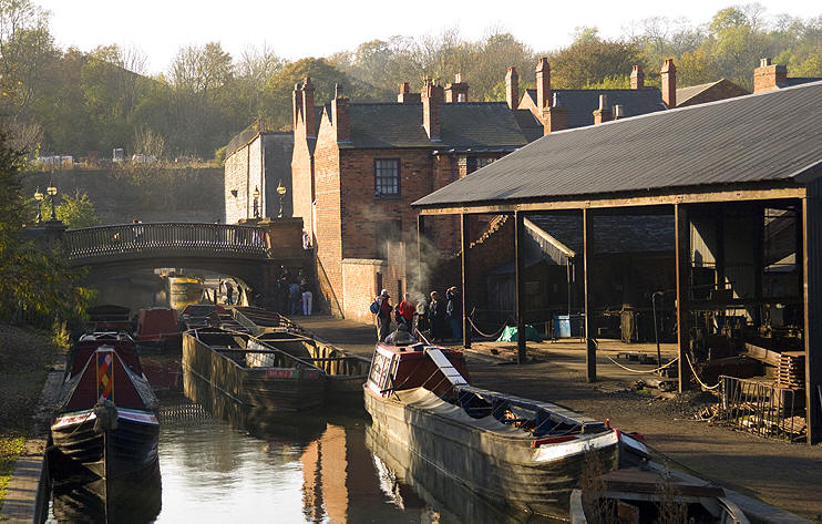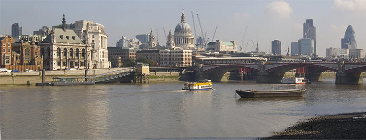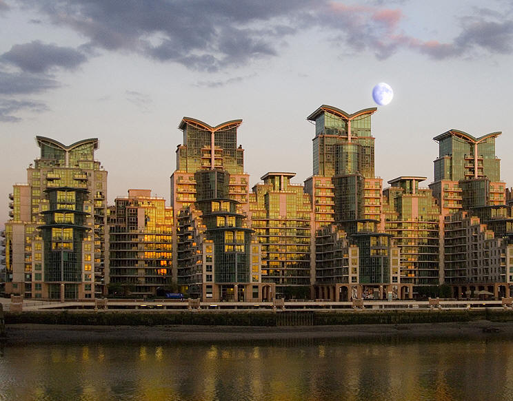 here can be glimpsed the new high-tech Canary Wharf in the distance, centre