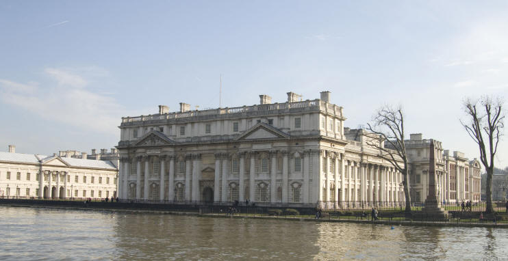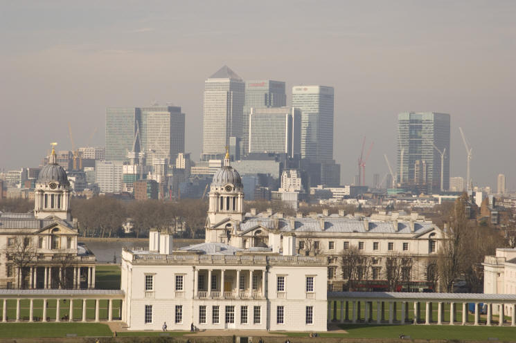 The Old Naval College and Queen's House in Greenwich with Canary Wharf